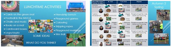 This weeks assembly was about the changes we have started to make to our lunchtimes again. We met with the school council who asked their classes what they would like to see more of on the playground and now we have a new rota with new activities including the Wiggle cars and musical instruments. We also know which senior leader will be supporting our play and our behaviour.